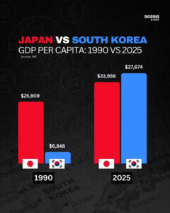・IMFの2024年資料によると、韓国の1人あたりGDPは日本を抜いている。円安や日本の低成長、韓国の輸出好調が要因