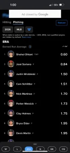 大谷の投手ランキング。規定投球回に到達している投手の中でERAトップ。名前の横がPじゃなくてTWP(二刀流)なのが好き。本当に唯一無二の存在だ。しかもWrobleskiが3位に入ってるのもすごい。